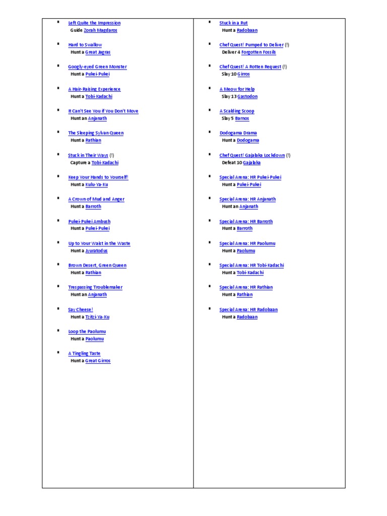 Actually, the easiest answer was the actual answer. Run along now and complete this quest if you want your new toy. *unlocks a new specialized tool on first time completion. Run along now and complete this quest if you want your new toy. I've complete a sore site, and completed all delivers that aren't related to layered armor and have spotted a black diablos. Fri aug 17, 2018 2:20 pm. Feb 19, 2018 · about press copyright contact us creators advertise developers terms privacy policy & safety how youtube works test new features press copyright contact us creators. Aug 29, 2018 · for rrrrrumble in the waste! to unlock after all prerequisites were done. Sigh i've already told you what i want you to do. You need to see a black and a normal diablos first so you see the optional quests first 0. I tried everything to unlock rrrrrumble in the waste!. Just like the last few quests, you will be faced with some old foes in this one and there will be … Is an optional quest in monster hunter world (mhw).